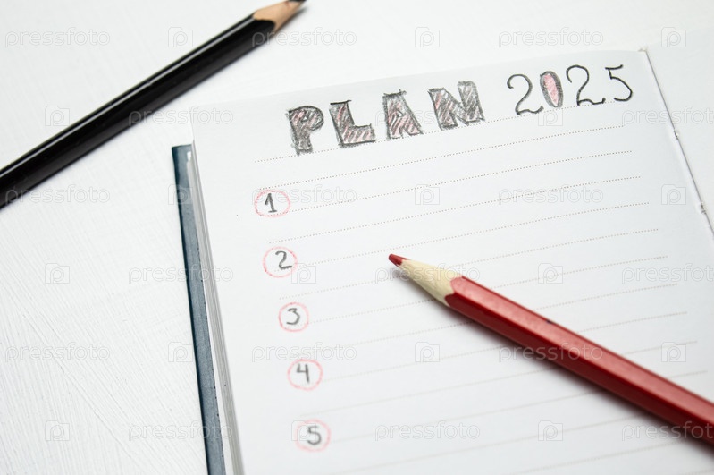 Блокнот и план-график на 2025 год, несколько карандашей и мандарин