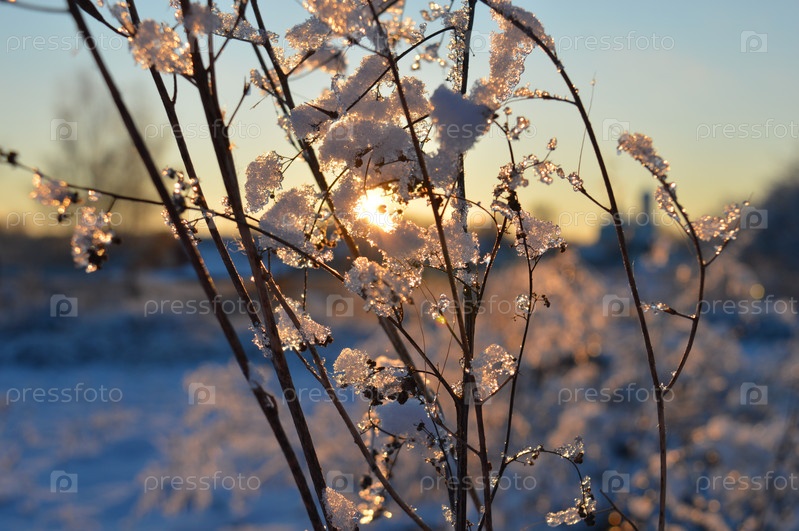 Вид на закат сквозь замерзшие ветви кустов елки в зимнем пейзаже. Красивые зимние фоны