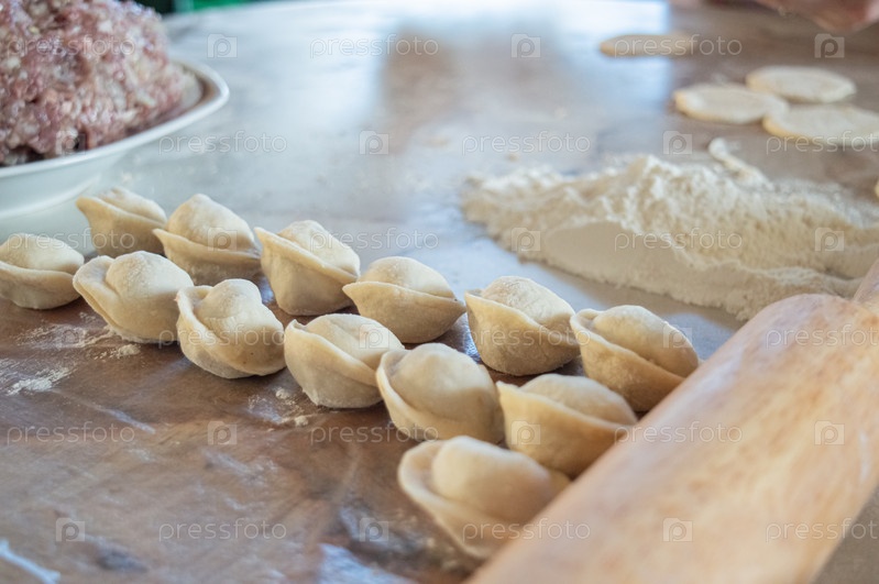 Подлинное фото приготовления пельменей дома. На столе тесто, мука и фарш с луком для пельменей
