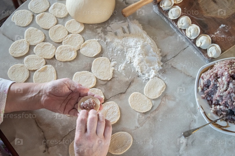 Подлинное фото приготовления пельменей дома. На столе тесто, мука и фарш с луком для пельменей