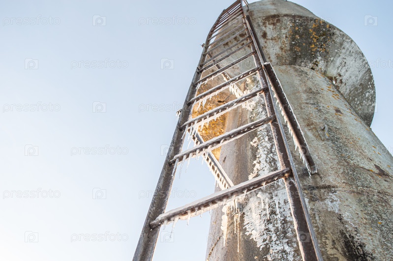 Ледяная лестница, ведущая к металлической водонапорной башне. Старая металлическая лестница покрыта сосульками снизу доверху. водонапорная башня на фоне неба
