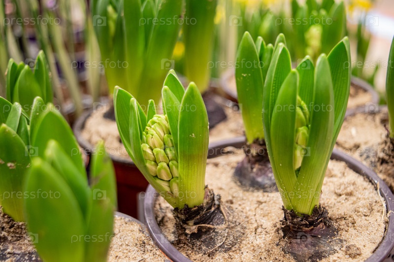 Молодые побеги гиацинтов в горшках. Луковичные домашние цветы в пластиковых горшках. Гиацинты — удивительные цветы, с множеством соцветий