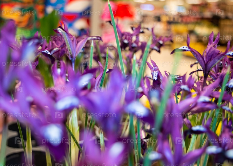 Короткий карликовый фиолетовый ирис цветущий домашний цветок в горшке. фиолетовое тройное соцветие на длинном стебле