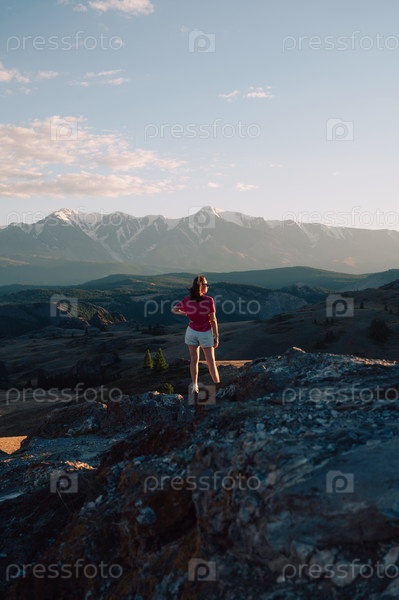 Женщина в повседневной одежде стоит на скалистой вершине, глядя на живописные горы и огромную долину под золотистым солнечным светом