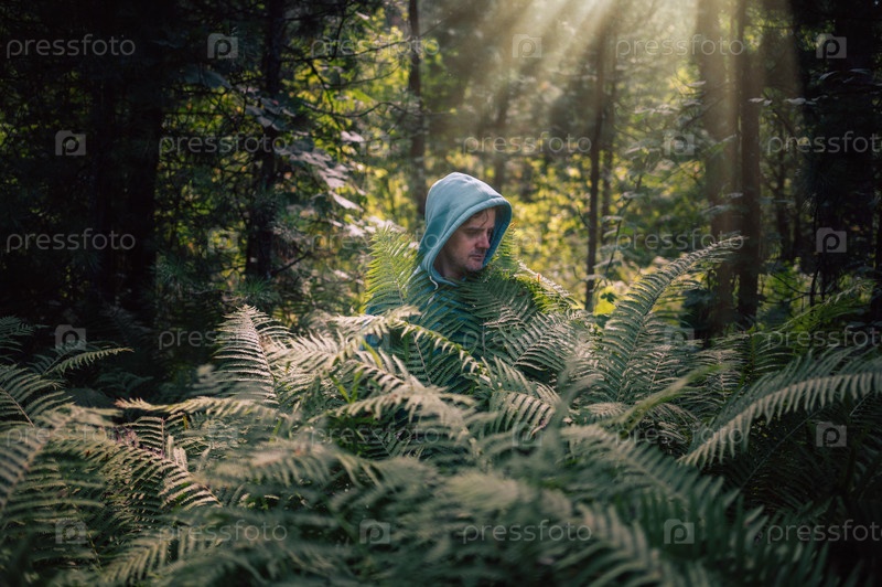 Человек, спрятавшийся среди пышных лесных папоротников