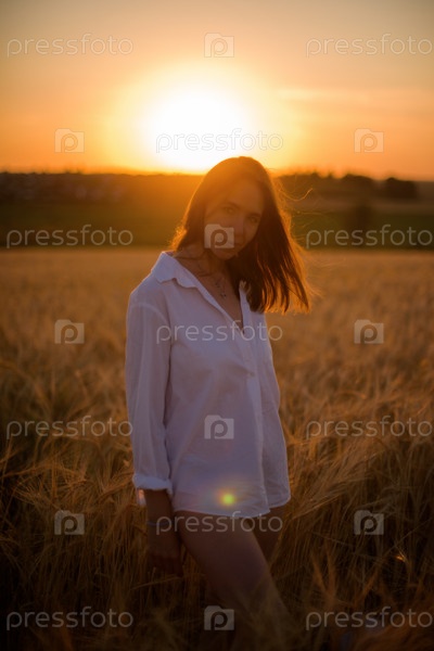 Женщина в белой рубашке на закате в поле