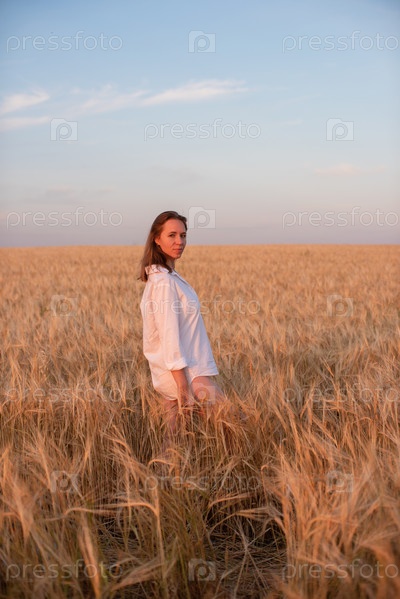 Молодая женщина в белой рубашке стоит на золотистом пшеничном поле во время заката, залитая теплым светом