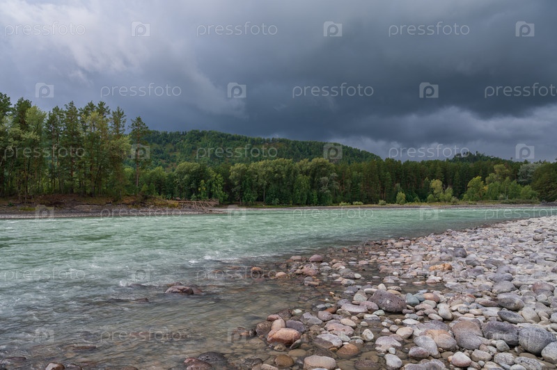 Быстрая горная река Катунь на Алтае, Сибирь, Россия. Облачное небо перед дождем