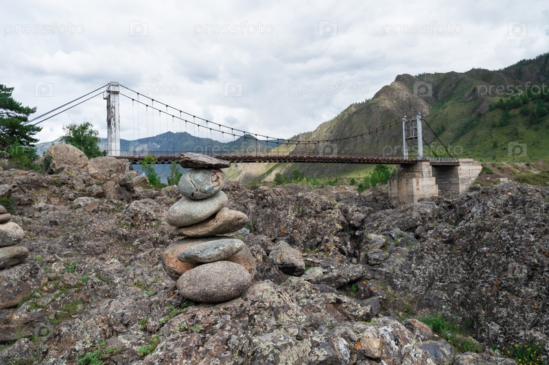 Быстрая горная река Катунь и мост Ороктой на Алтае, Сибирь, Россия