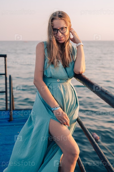 Женщина в развевающемся платье на пирсе у моря
