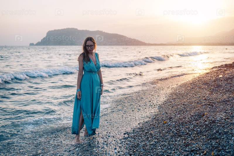 Женщина в развевающемся зеленом платье позирует на пирсе у моря на закате, на заднем плане развевается флаг Турции