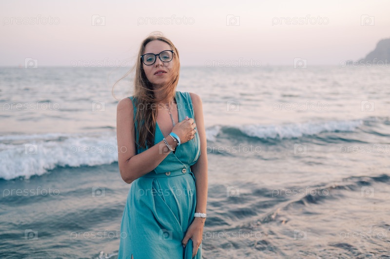 Женщина в развевающемся платье на пирсе у моря