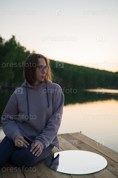 Женщина с зеркалом на пирсе у озера, портрет крупным планом, летний закат
