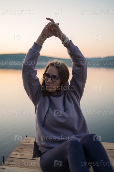 Женщина сидит на пирсе, портрет крупным планом, летний закат