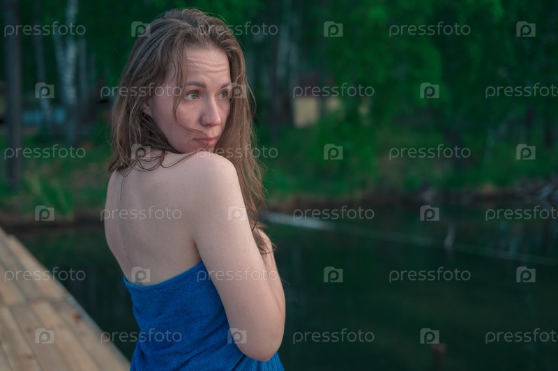 Молодая женщина с мокрыми волосами, завернутыми в синее полотенце, стоит возле спокойного озера на закате, задумчиво глядя вдаль