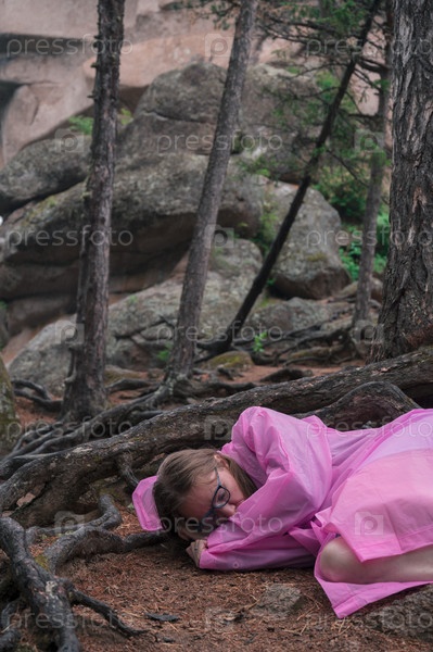 Женщина в струящемся розовом платье спит на земле под переплетенными корнями деревьев в лесу с возвышающимися скальными образованиями
