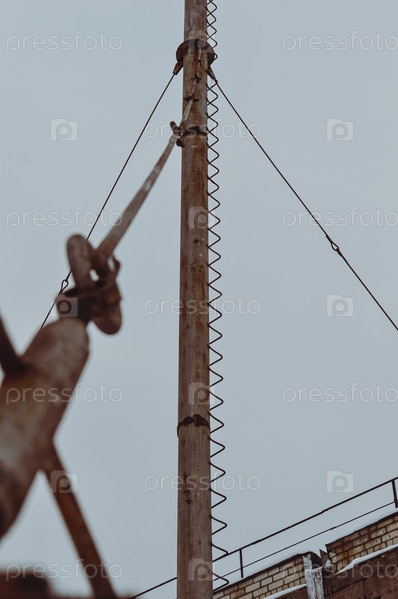Мрачный зимний снимок металлического троса, поддерживающего ржавую трубу в отопительном помещении заводских цехов в Европе
