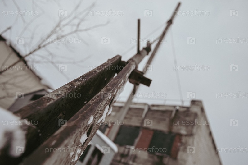 Мрачный зимний снимок металлического троса, поддерживающего ржавую трубу в отопительном помещении заводских цехов в Европе
