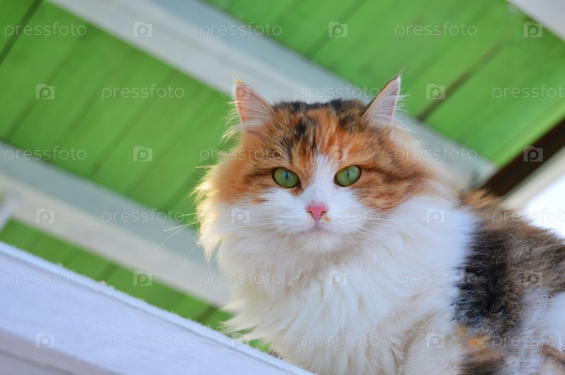 Трехцветный кот с зелеными глазами смотрит в камеру. На заднем плане зеленый потолок