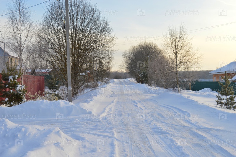 Заснеженная европейская деревенская дорога в солнечный декабрьский день