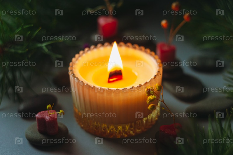 Красивая ароматическая свеча в прозрачном подсвечнике горит на темном фоне