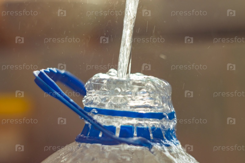 Струя воды заполняет пластиковый контейнер. поток воды вливается в пластиковую бутылку с ручкой, полную до краев