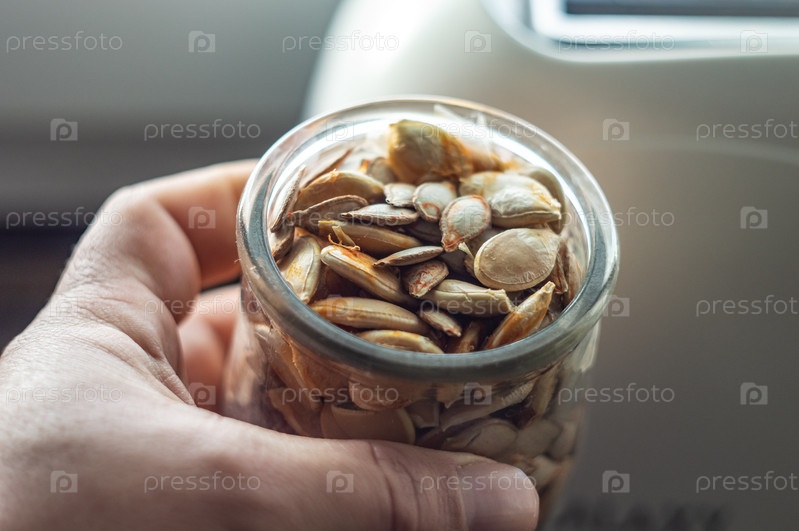 Подлинное фото в руке мужчины банка с тыквенными семечками с остатками тыквы на них. натуральное не заводское домашнее хранение и сушка