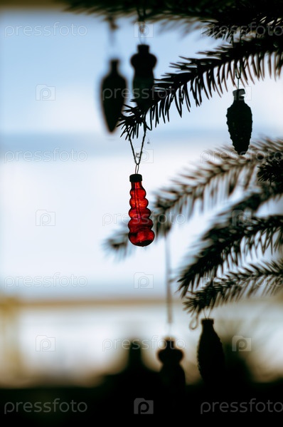 Силуэт елки украшен различными игрушками, среди которых прозрачное красное стекло выделяется на фоне окна. подлинное фото без постановки привычных домашних условий в новом году. Высокое качество фото