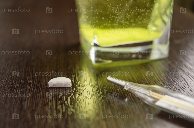 В комнате, на тумбочке у кровати, стоит стакан с желтым лекарством, рядом термометр и таблетка витамина С