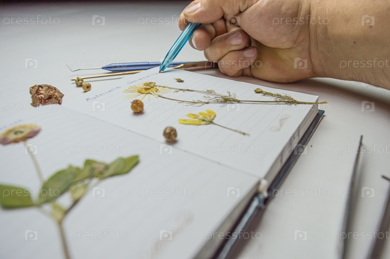 Рабочее место биолога-ботаника и кабинет гербария видов растений. засушенный цветок на белом фоне и название на латыни