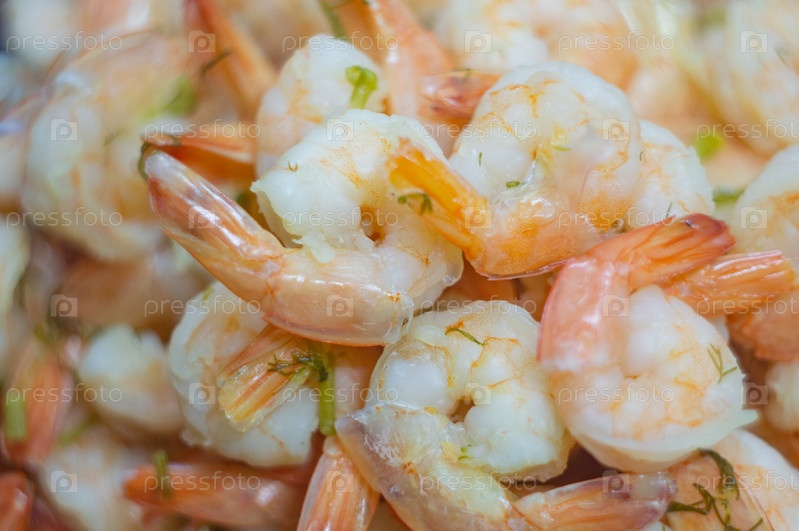 Вареные красно-розовые креветки с зеленью разбросаны в куче