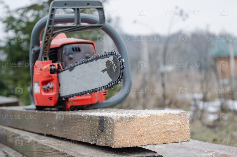 Старая рабочая бензопила лежит на распиленной доске пятьдесят миллиметров. Фотографии на улице во дворе для идей строительства из дерева и досок