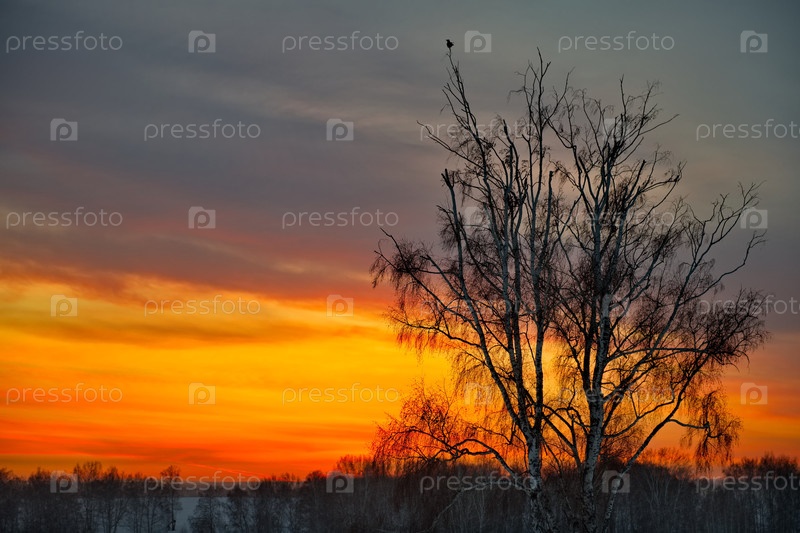 Россия, Южный Кузбасс. Красочный живописный восход солнца морозным утром на заснеженных полях
