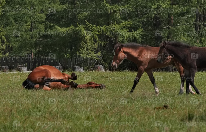 Россия. Западный Саян. Республика Бурятия. Молодой жеребец резвится на зеленом пастбище между гор и лиственниц недалеко от деревни Орлик
