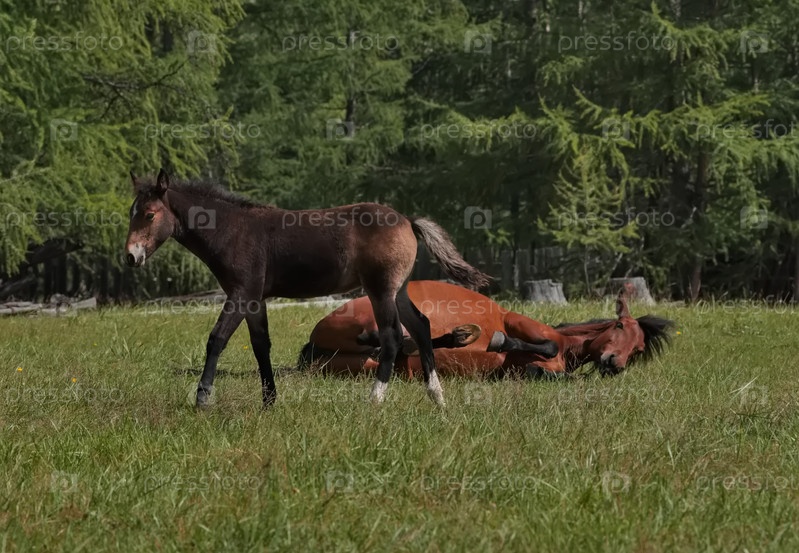 Россия. Западный Саян. Республика Бурятия. Молодой жеребец резвится на зеленом пастбище между гор и лиственниц недалеко от деревни Орлик