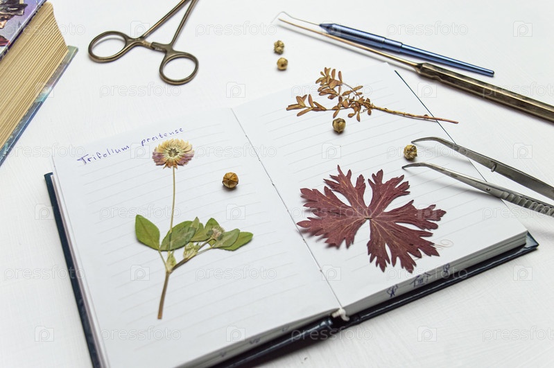Рабочий стол с блокнотом и гербарием различных растений и семян. Занятие по хранению эскизов и других биологических экспериментов и исследований видов растений и цветов
