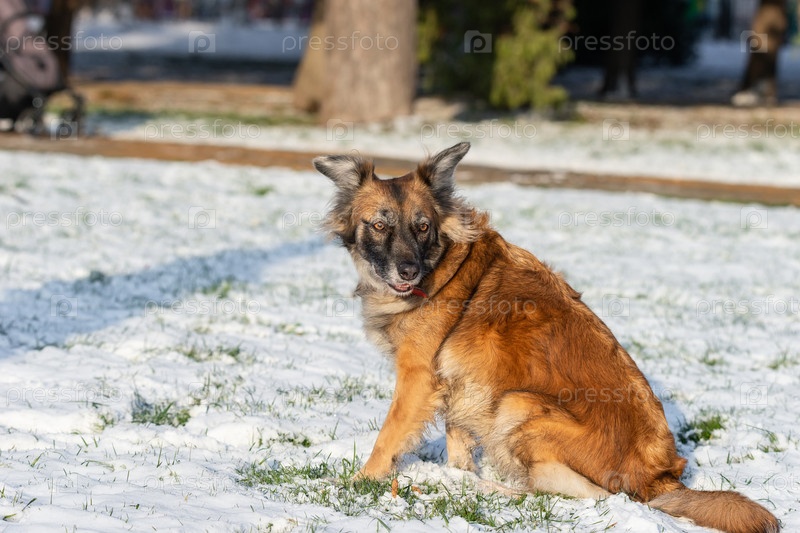 Симпатичная рыжая с белым собака дворняга на зимнем фоне