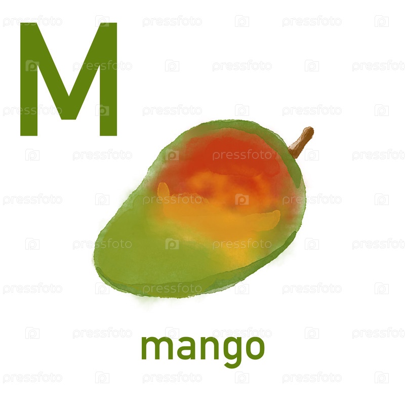 Акварельный английский алфавит из милых фруктов и овощей. Акварельная иллюстрация еды. Вегетарианский алфавит. Назад в школу. Манго