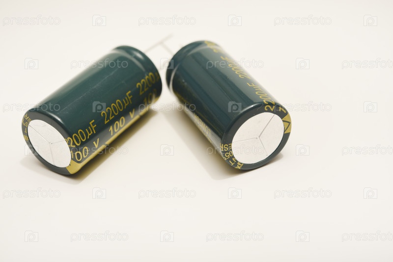 Электролитические конденсаторы на белом фоне. Электронные элементы для электронных устройств
