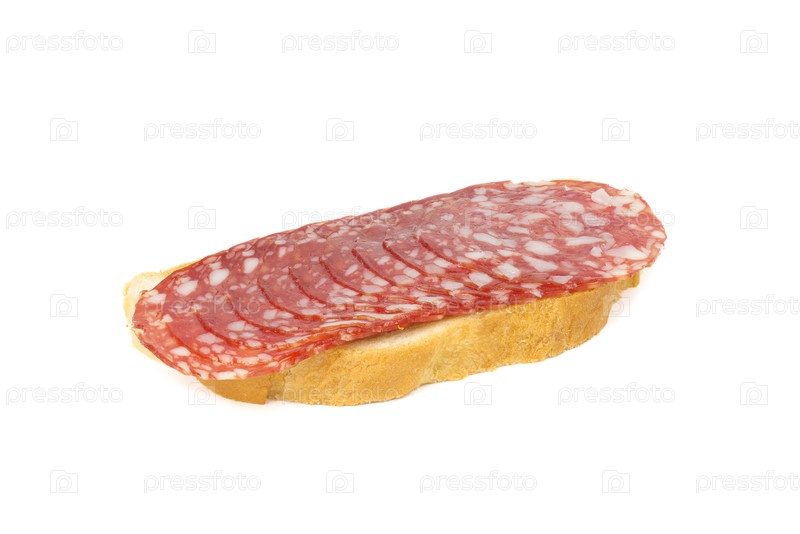 Ломтик хлеба с салями, изолированный на белом фоне