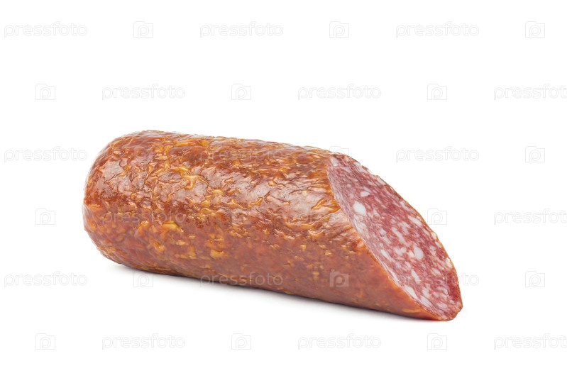 Кусок копченой колбасы салями, изолированный на белом фоне