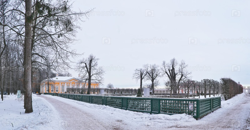 Вид с террасы Финского залива на дворец Монплезир и здание Екатерининского корпуса (Петергоф, Санкт-Петербург) зимой