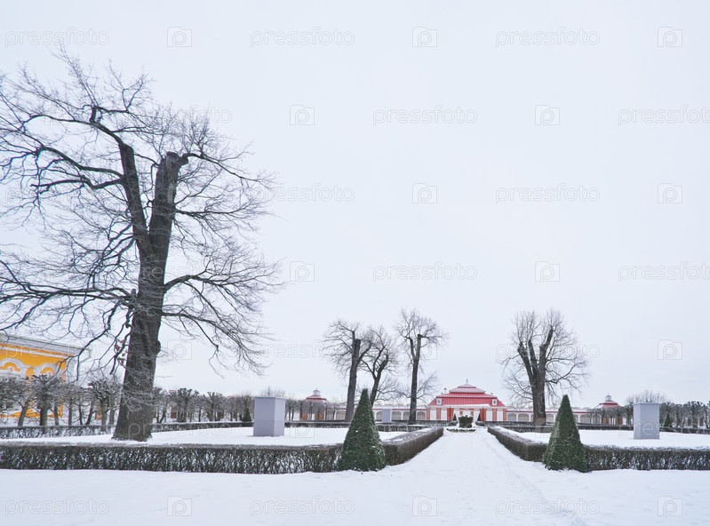 Вид с террасы Финского залива на дворец Монплезир (Петергоф, Санкт-Петербург) зимой