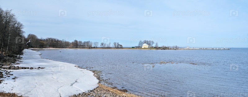 Вид на Петергофскую Военную гавань (Морская пристань «Петергоф») с террасы дворца Монплезир (Петергоф, Санкт-Петербург) весной