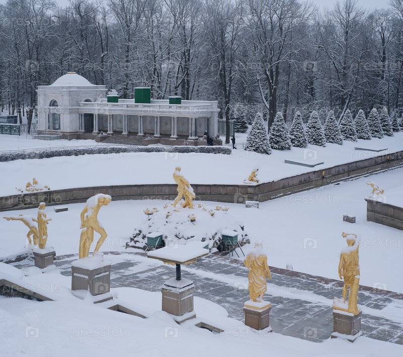 Зимний пейзаж в нижнем парке Петродворце (Петергоф, Санкт-Петергоф). Вид на большой каскад