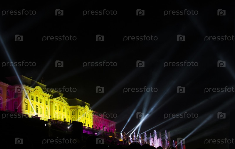 Нижний парк Петродворца, Большой Дворец и Большой каскад (Петергоф, Санкт-Петербург). Ночной пейзаж с яркой иллюминацией