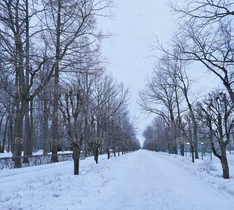 Вид на памятник русскому царю Петру I на Марлинской аллее (Петергоф, Санкт-Петербург) зимой