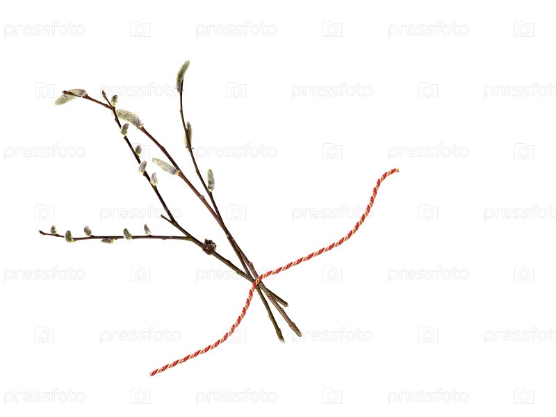 Шаблон пасхального плаката. Молодые ветки деревьев и красная лента на белом фоне