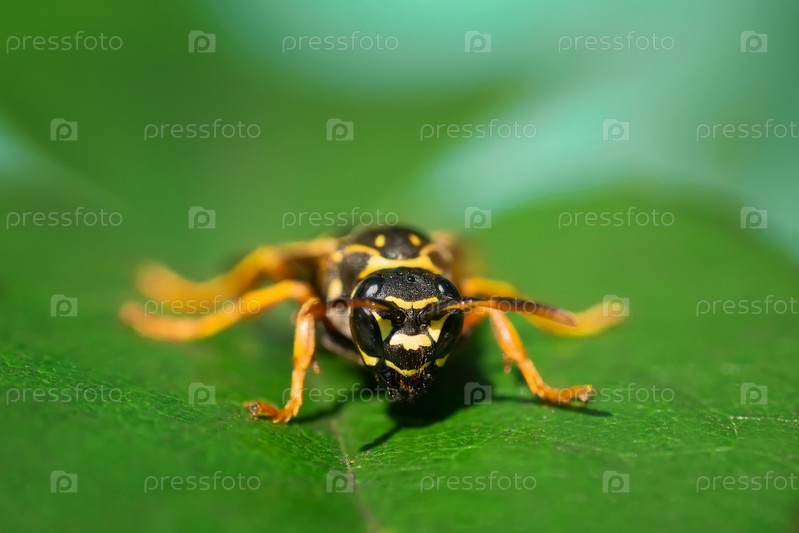 Оса сидит на зеленых листьях. Опасная желто-черная полосатая оса сидит на листьях