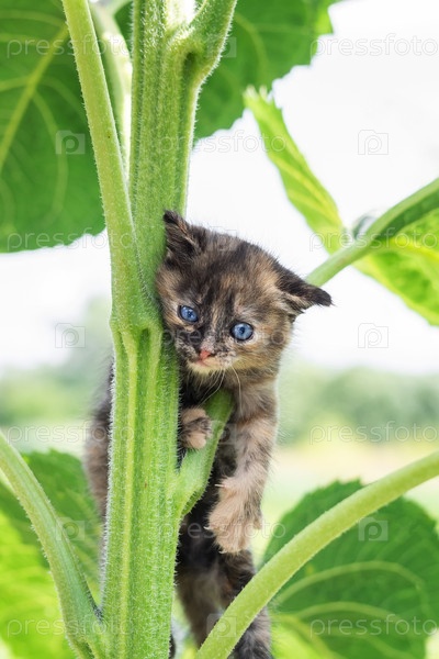 Маленький котенок на растении подсолнечника